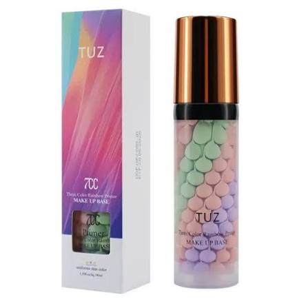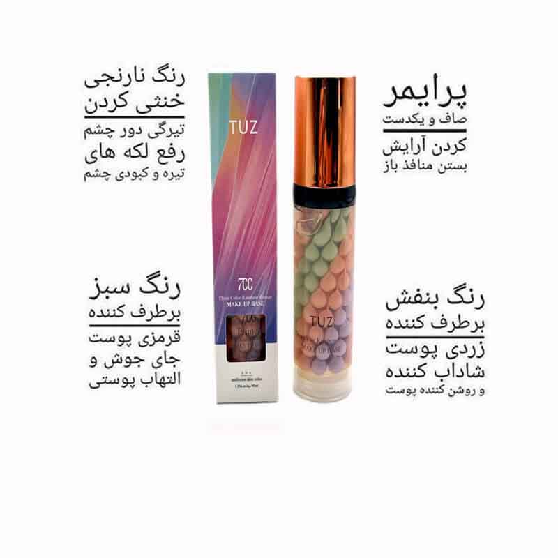 پرایمر رنگین کمانی و زیرساز آرایشی توز tuz از چرب شدن و براقی پوست جلوگیری می کند. این محصول به دلیل رنگی بودن بسیاری از مشکلات پوست را خنثی می کند. از جمله گودی و تیرگی دور چشم، جوش و جای جوش، التهاب و قرمزی و لک های پوستی را رفع می کند.با توجه به خاصیت تثبیت کننده کنندگی باعث می شود که کرم پودر به درستی روی پوست نشسته و دوام و ماندگاری آرایش را بالا می برد. رنگ نارنجی ، خنثی کننده و برطرف کننده گودی و تیرگی دور چشم، رنگ بنفش برطرف کننده زردی پوست و رنگ سبز برطرف کننده قرمزی و جای جوش های صورت می باشد.